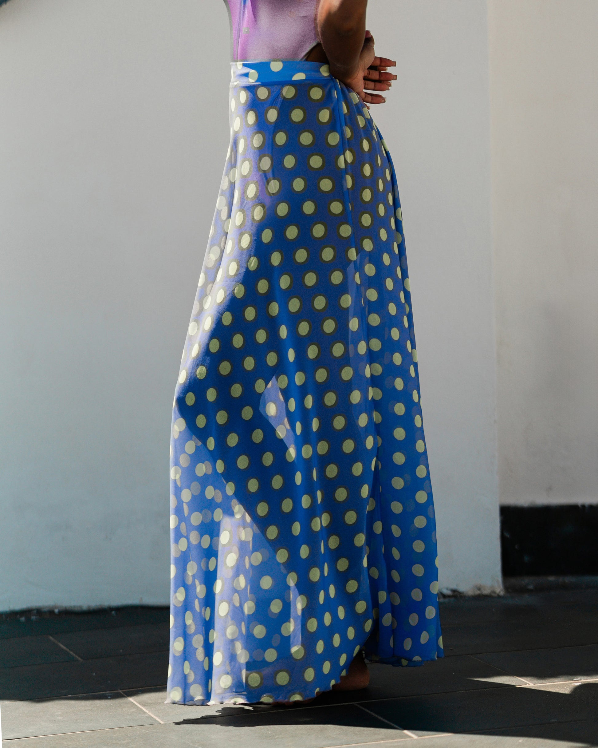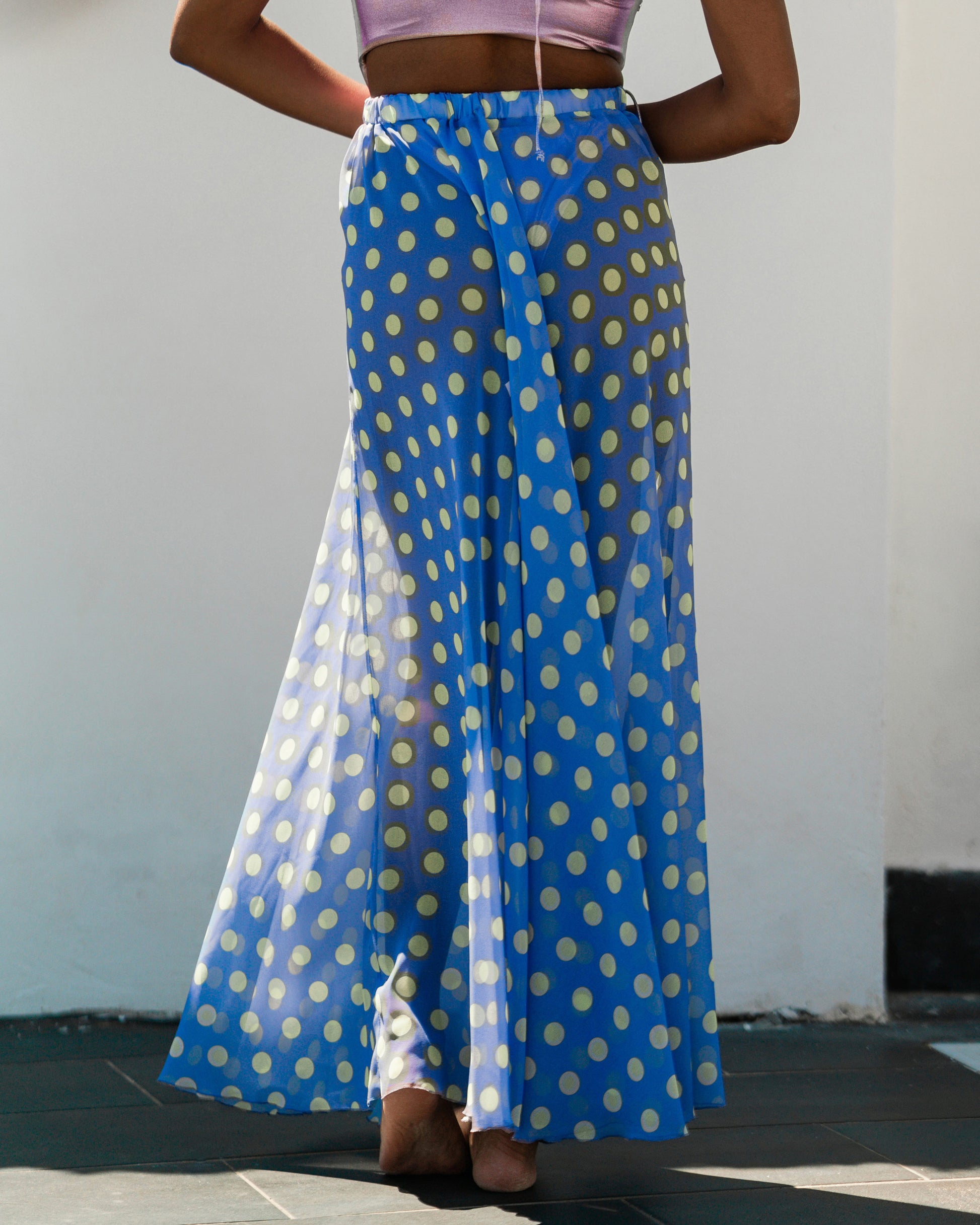 La scelta perfetta per il tuo stile estivo. Maxi gonna lunga in georgette a pois color lime. Leggera e sinuosa ideale come fuoriacqua o una serata frizzante.