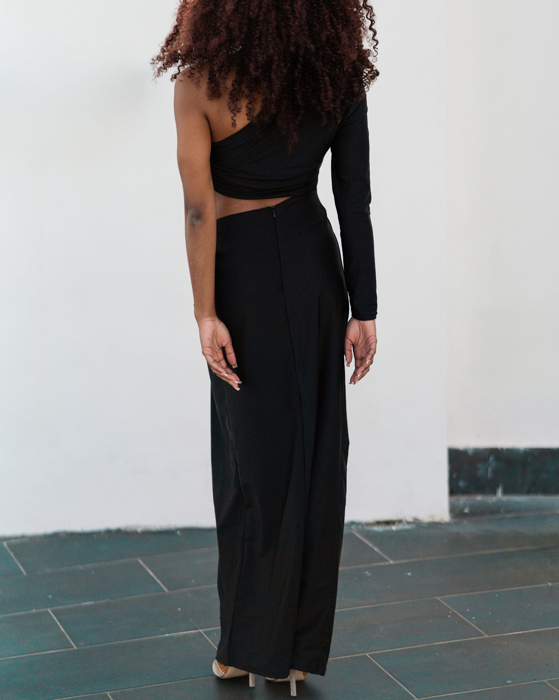 Migliora il tuo stile con il maxi abito in lycra nero Con il suo materiale lucido e una manica lunga, questo abito richiede attenzione. La pancia scoperta e la gamba con il suo spacco vertiginoso aggiungono un tocco audace, perfetto per la tua prossima serata o il tuo prossimo evento. Completa il look con tacchi e orecchini per un outfit da passerella.